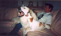 Thuis gaat het leven zijn eigen gangetje en Caldo groeit als kool. En voordat we het weten is het tijd om naar de Clubmatch te gaan. We (lees Caldo) krijgen bewonderende blikken als we het terrein opkomen. Wie is dat nou? Voordat we binnen zijn, hebben we deze vraag al 5x gehoord. We begrijpen er niets van: Caldo is gewoon onze Caldo, de huishond! Maar Caldo blijkt, voor de fokkers die aanwezig zijn, toch de moeite waard om eens nader te bekijken. We weten nu wat ons te wachten staat en ik heb natuurlijk geoefend met Caldo. Hij gedraagt zich keurig in de ring, loopt netjes de rondjes mee (ik heb dit keer mijn slippers thuisgelaten!) en blijft staan als de keurmeester hem betast. Alleen tanden kijken; daar was hij niet van gediend door deze meneer hoewel het thuis toch heel goed ging. In gedachten staan we al op de 1e plaats want hij ziet er echt heel goed uit. En dan wordt er geplaatst; 4e plaats, de keurmeester komt naar ons toe met een spijtige blik in zijn ogen. “Prachtig exemplaar” en vervolgens een opsomming van die onderdelen waaraan Caldo voldoet volgens de rasstandaard en -type. Zouden ze misschien dan toch eerst nr.1 plaatsen i.p.v. nr. 4? Hij helpt ons gauw uit de droom; Caldo krijgt “weinig belovend” vanwege zijn gebit. Wat krijgen we nu weer?! Hij heeft een ondervoorbijtend gebit volgens de keurmeester. Al piekerend verlaat ik de ring want ik heb geen idee wat ondervoorbijtend is. Het moet wel iets verschrikkelijks zijn want de hond die er niet eens uitziet als een Pyreneese Berghond wordt nog voor ons geplaatst. Mensen komen naar mij toe;”Wat is er gebeurd?’. Als ik zeg:” Hij heeft een ondervoorbijt, geloof ik”, kijken ze mij ineens medelijdend aan. “Wat zonde!”, om vervolgens Caldo’s mond open te trekken en te kijken naar dat blijkbaar ondervoorbijtend gebit. ”Hij heeft helemaal geen ondervoorbijt!!” Ja maar, de keurmeester zegt van wel. “Heb je niet geprotesteerd?” Nee, ik kan moeilijk met iemand in discussie gaan als ik op dat moment niet weet wat ondervoorbijt is. Jack is teleurgesteld maar nadat ook hij vervolgens in Caldo’s mond heeft gekeken, wordt hij toch een beetje boos; “wat nou ondervoorbijtend” en sleept Caldo en mij mee naar mevrouw Jasica op het moment dat ze klaar is met het keuren van de teven. “Mevrouw Jasica, wilt u eens even kijken?”. Ze kijkt en Caldo ondergaat het lijdzaam voor de zoveelste keer. Hij heeft toch blijkbaar een voorkeur voor wie er in zijn mond mag kijken (of is het afkeur voor wie niet?) “Ja, en”, vraagt ze vriendelijk aan Jack. “Volgens de keurmeester heeft hij een oncdervoorbijt”. Ze doet Caldo’s mond nog eens open en kijkt nog een keer. “Dat is beslist niet waar, het mag op het moment wat krap zijn maar dit is beslist geen ondervoorbijt’, zegt zij resoluut. Nou dan gaan we natuurlijk even naar de keurmeester, hè, om dat recht te zetten zodat hij dat kan veranderen op het keurrapport en misschien worden we dan wel wat hoger geplaatst (naïef, naïef). “Ja, maar zo werkt dat niet, geplaatst is geplaatst en de keurmeester verandert heus dat keurrapport niet”, krijg ik te horen. En die dag kom ik er op een heel vervelende manier achter dat er maar één baas is in de ring en dat alleen zijn mening de ware is en dat is de keurmeester!! Later zullen we de betreffende keurmeester weer tegen komen en dan roemt hij Caldo’s fraaie Franse hoofd en rept hij geen woord over zijn zgn. ondervoorbijtend gebit.